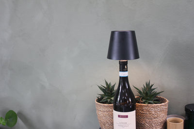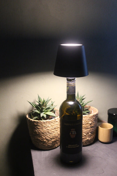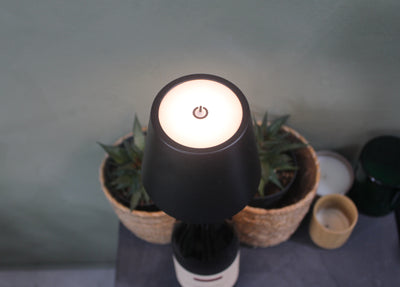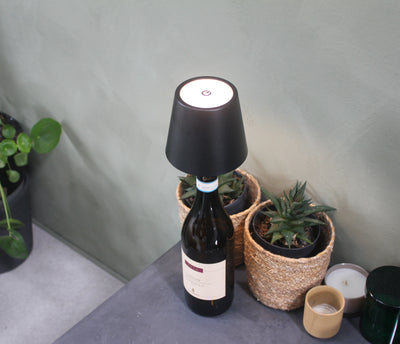 Vinoir-lampen sættes direkte i en tom flaske og tændes via en knap på toppen. Den er trådløs og genopladelig, så du slipper for ledninger og stik.
