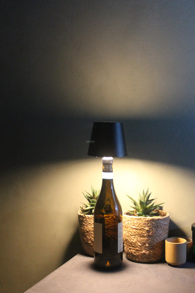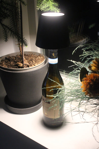 Bottle Light sættes direkte i en tom flaske og tændes med én knap. Den er trådløs og genopladelig – ingen ledninger, ingen besvær.